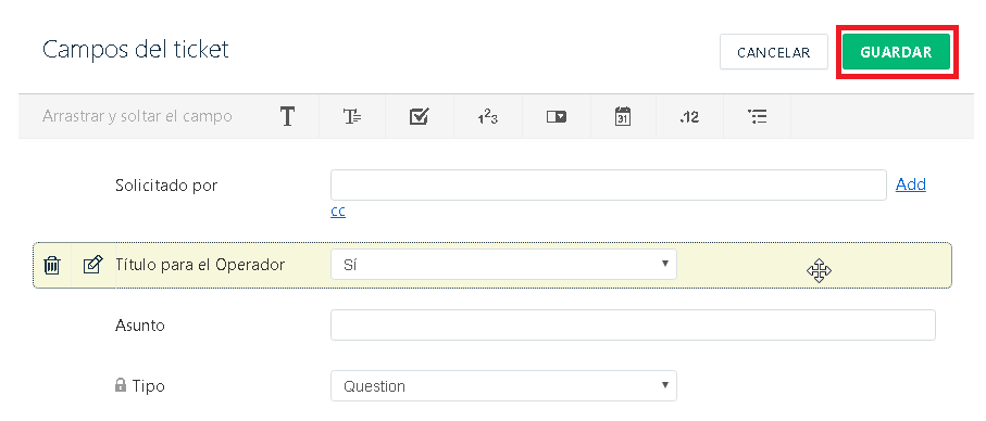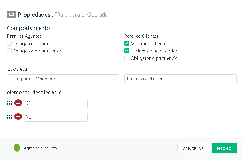 Y lo arrastramos hasta el punto que deseemos. A continuación determinaremos las opciones para el operador y el cliente, y rellenaremos los campos pertinentes de este nuevo campo.