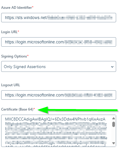Haremos a la configuración donde se incluye el certificado Base64 y pegaremos ahí los datos del que hemos descargado.