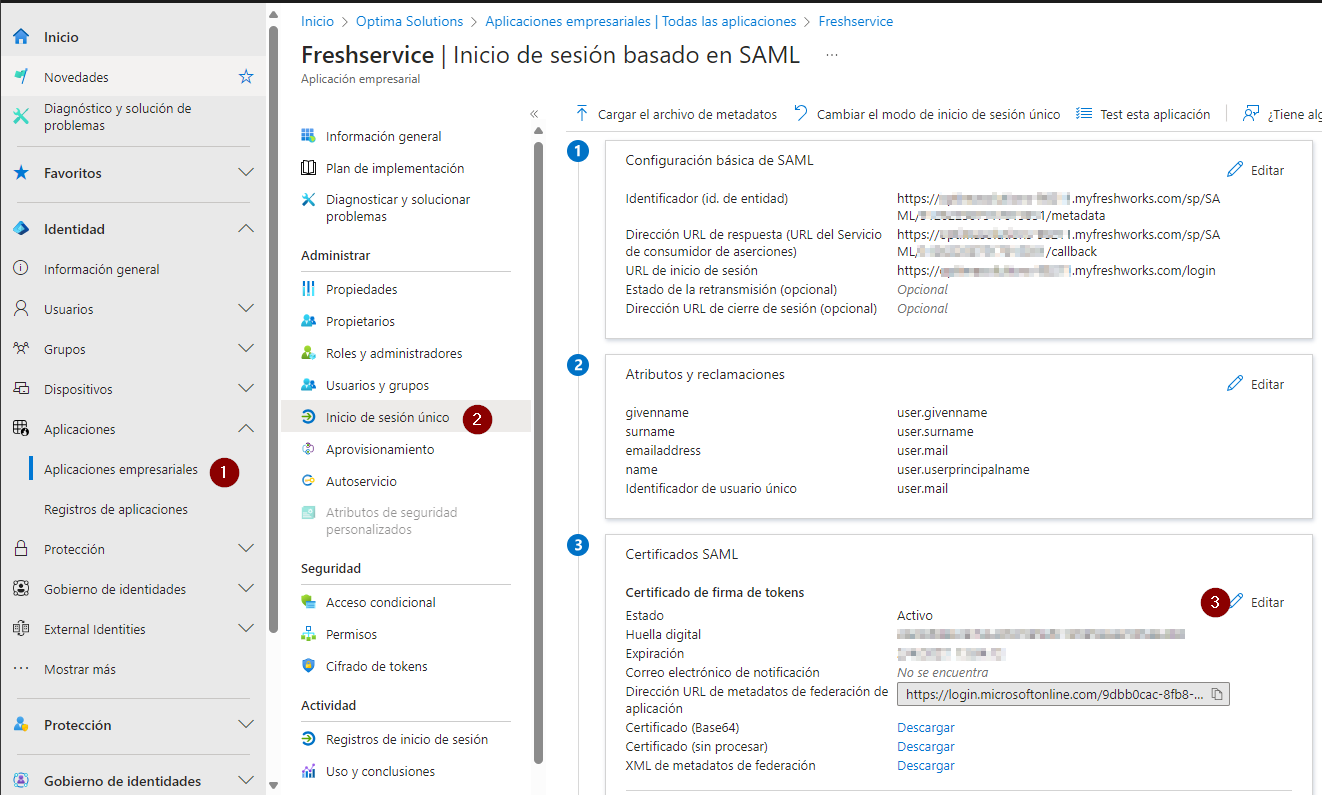 Buscamos en Aplicaciones empresariales >> Inicio de sesión único >> Certificados SAML botón Editar.