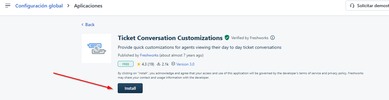 1 ) Navegar hasta el centro de aplicaciones de Freshservice y buscar "Ticket Conversation Customizations". Esta aplicación y, como administradores, os permitirá establecer que las conversaciones más recientes se muestren primero en la vista de detalles del ticket, facilitando así el acceso a la información más actualizada.