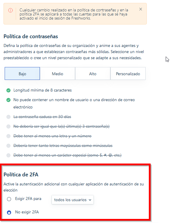 En Freshdesk tenemos la capacidad para aumentar la seguridad de las cuentas, de imponer 2FA como politica para todos o algunos usuarios