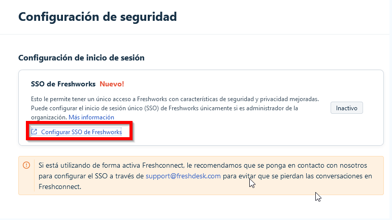 Con el Single Sign On (Inicio de Sesión Único) tus usuarios podrán acceder al portal de soporte mediante sus claves de acceso a Microsot, Google u otros accesos. Para configurar el inicio de sesión único en Freshdesk ve a la página Org de Freshworks. ...