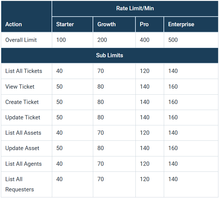 Las cuentas creadas a partir del 1 de septiembre de 2020 están sujetas a la limitación de llamadas por minuto. Los límites varían en función del plan de la cuenta de Freshservice. Algunas operaciones API también tienen sublímites dentro del límite general. Este límite se aplica a toda la cuenta, independientemente de factores como el número de agentes o las direcciones IP utilizadas para realizar las llamadas.
