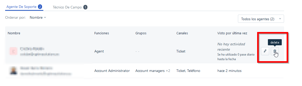 Para eliminar permanentemente este agente, siga los mismos pasos que para eliminar un contacto.