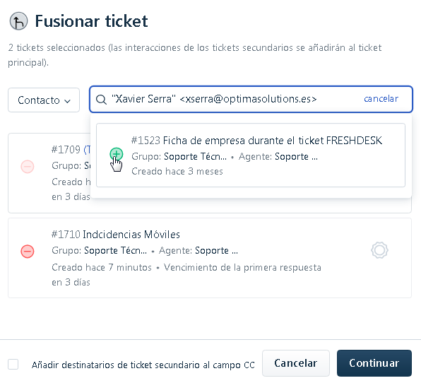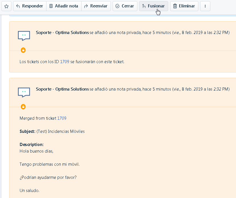 - También desde dentro un mismo ticket podremos fusionarlo con otro simplemente dándole a Fusionar. Además en la siguiente imagen se muestra resumidamente como han quedado los dos tickets anteriores fusionados: