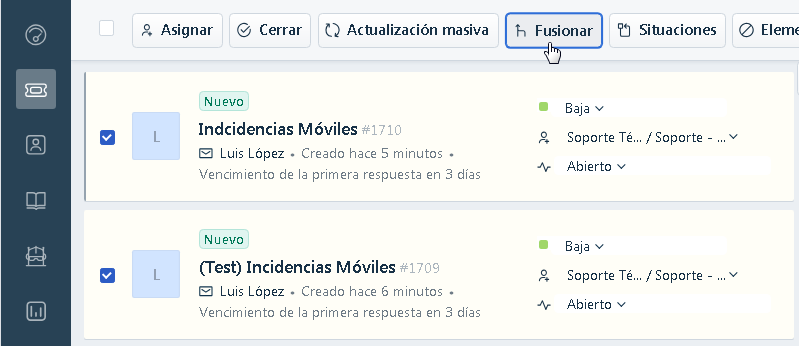 - Marcaremos el "check" de los dos o más tickets que queremos fusionar: