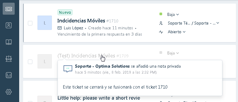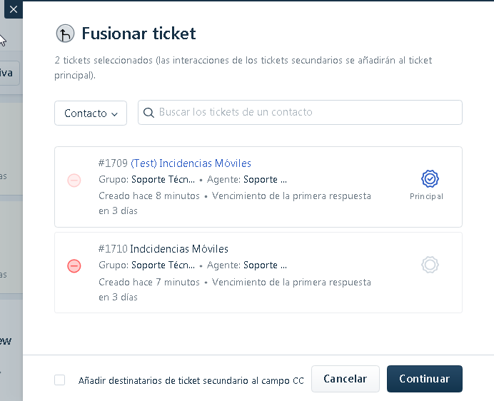 - Como podemos observar, en la vista general de tickets, este último se muestra como que se cerrará y se fusionará con el otro (en realidad ya se ha aplicado esta acción, no hay que hacer nada más ni esperar):
