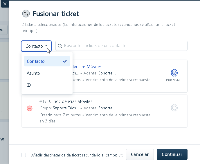- Si deseáramos añadir más tickets podremos hacerlo pulsando sobre el siguiente deplegable en que podremos buscar por Contacto, Asunto o ID de ticket: