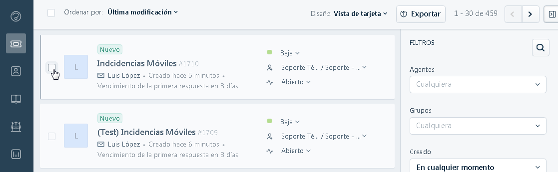 Como vemos en la siguiente imagen tenemos dos tickets sobre el mismo asunto. En este escenario, lo ideal sería fusionar los dos tickes para toda la información en uno. Para ellos realizaremos los siguientes pasos: