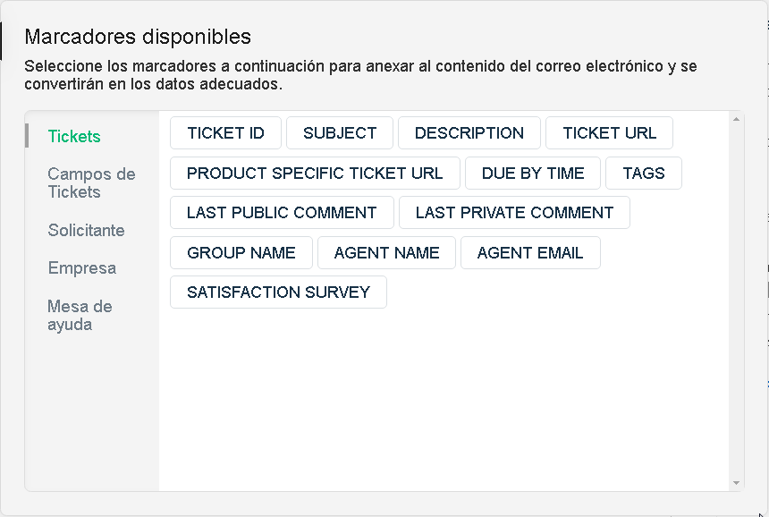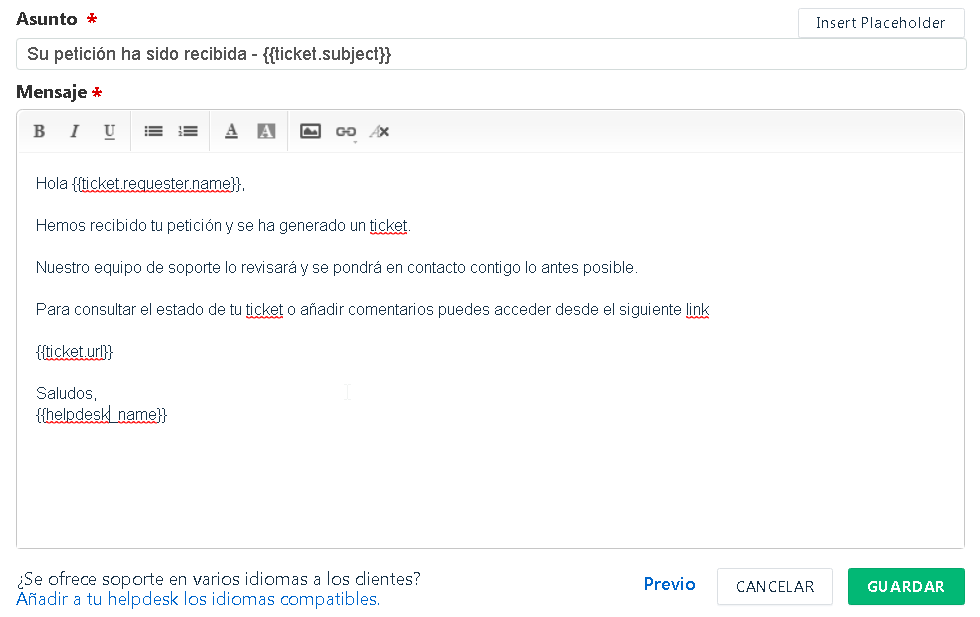 Además desde el botón situado en la esquina superior derecha Insert Placeholder podremos insertar Marcadores como por ejemplo TICKET ID que nos insertará automáticamente el ID del ticket que se ha creado.