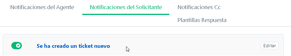 Pulsamos sobre la pestaña Notificaciones del Solicitante y a continuación sobre Se ha creado un ticket nuevo