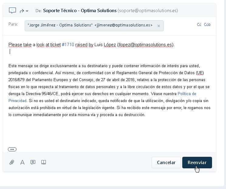 - Para finalizar, en el campo "Para:" escribiremos la dirección de correo del agente que queramos que reciba el ticket. Podremos editar si lo deseamos el cuerpo del mensaje, así como adjuntar archivos. Por último pulsaremos en Reenviar.